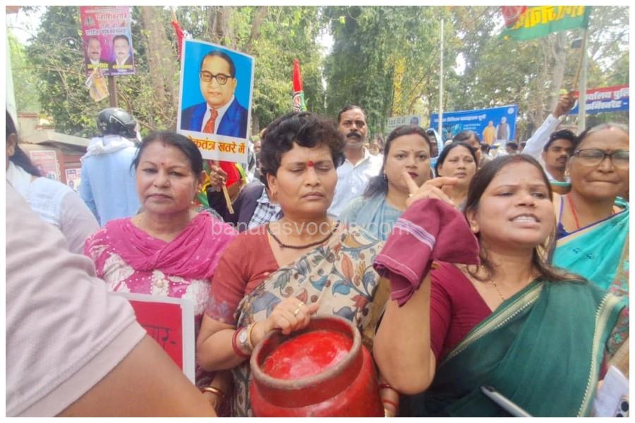 वाराणसी में गैस किल्लत पर सपा महिला विंग का प्रदर्शन, खाली सिलेंडर लेकर किया विरोध
